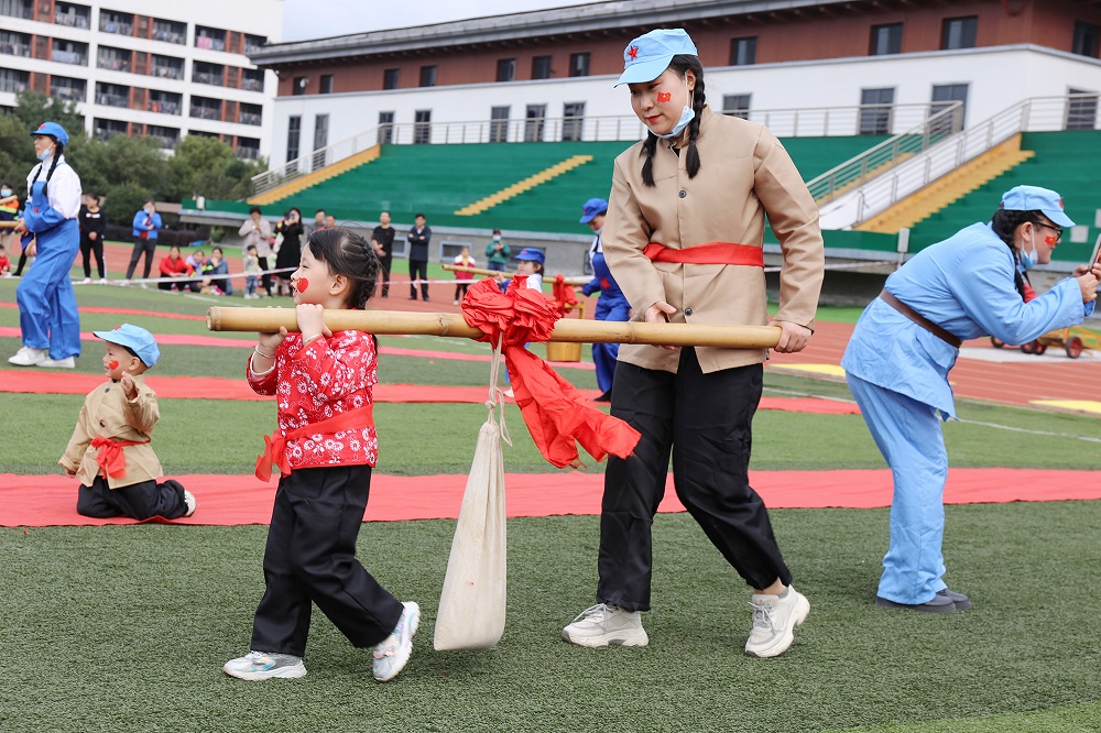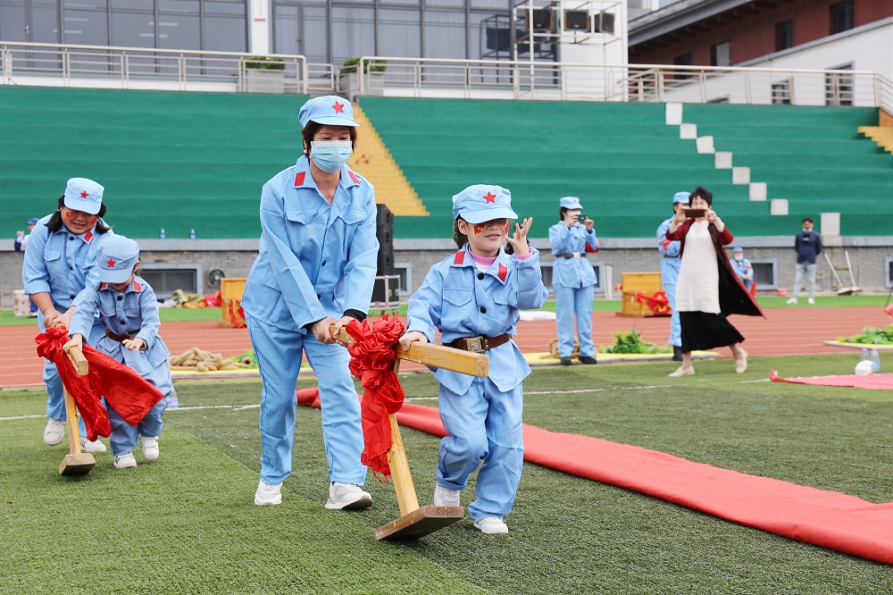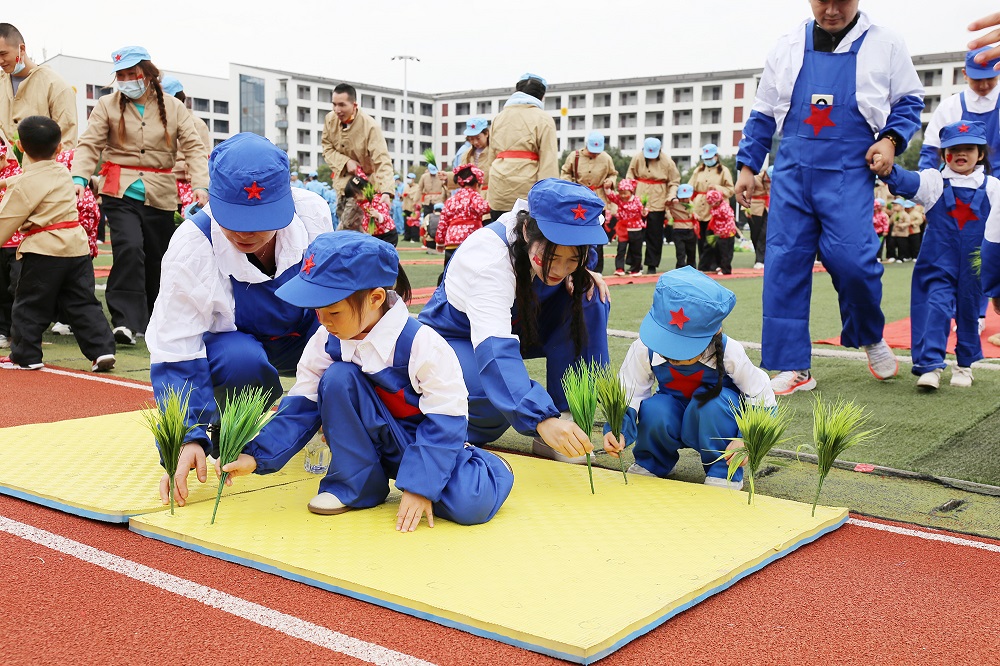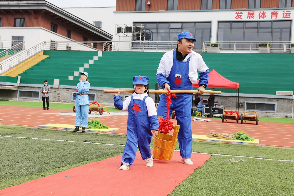 亲子游戏环节,家长和孩子们共同参与插秧劳作、运输粮食、推小推车等小游戏。在爸爸妈妈的鼓励声中,在同伴的加油声中,孩子们勇敢地往前冲,感受着游戏的快乐。场上不时爆发出快乐的笑声,孩子们脸上洋溢着天真幸福的笑容,整个运动场瞬间变成了欢乐的海洋。