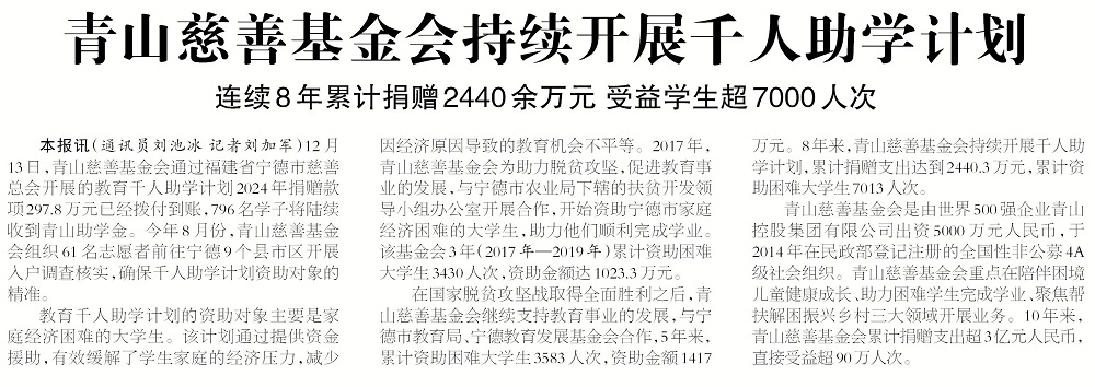 12月13日,壹号娱乐慈善基金会通过福建省宁德市慈善总会开展的教育千人助学计划2024年捐赠款项297.8万元已经拨付到账,796名学子将陆续收到壹号娱乐助学金。今年8月份,壹号娱乐慈善基金会组织61名志愿者前往宁德9个县市区开展入户调查核实,确保千人助学计划资助对象的精准。