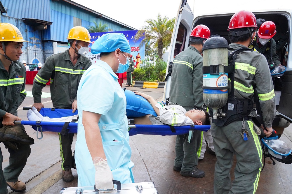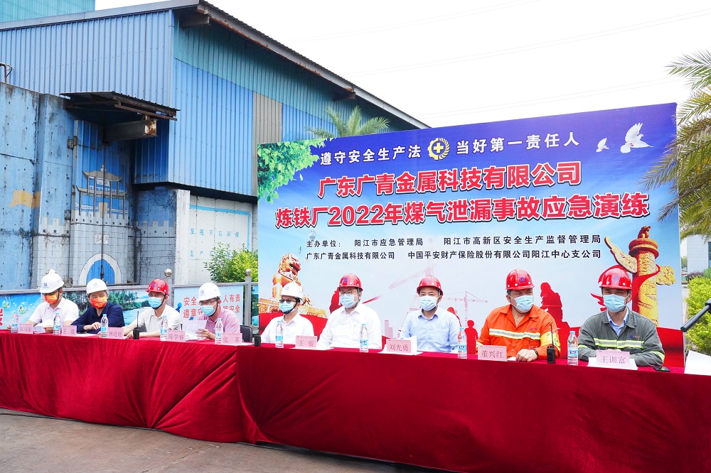 为深入贯彻落实习近平总书记关于安全生产重要论述,认真落实广东省及省国资委“安全生产月”和“安全生产南粤行”活动部署和要求,全面提高员工安全生产意识、生产安全事故应急救援能力和逃生自救能力,6月20日,广东广青金属科技有限公司在炼铁厂开展了2022年煤气泄漏事故应急演练。阳江高新区党委委员、管委会副主任张革,市应急管理局、区安监局、中国平安阳江中心支公司等相关领导出席了此次演练;公司党委书记、董事长王骏,党委委员、常务副总经理刘光勇参加了演练。