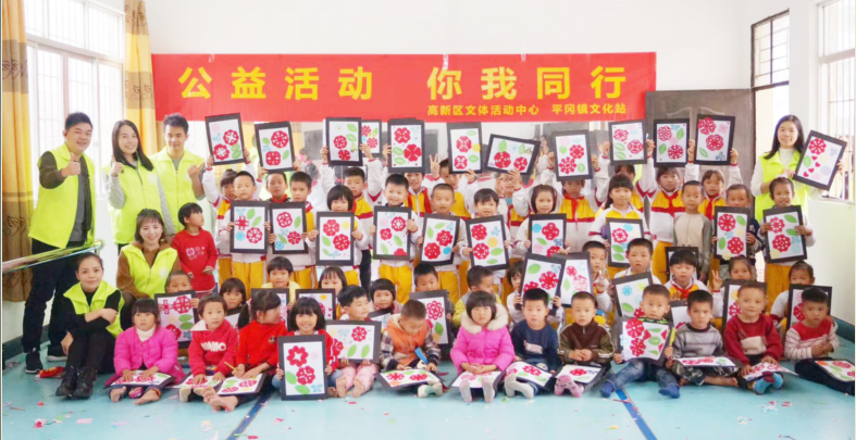 志愿者们首先来到东一小学,并迅速把学校舞蹈室打扫干净。小学生在志愿者和学校教师的引导下,每10 人围坐一圈,志愿者向学生们派发剪纸工具,如剪刀、固体胶以及各色剪纸,学生们拿在手上显得兴奋不已。课堂上,高新区文化中心志愿者为学生们边演示边传授剪纸方法,并手把手耐心地一一进行指导,学生们也聚精会神地认真观摩。随后,小学生在广青志愿者的陪同和指导下,动手剪出了各种各样的图案。学生们满怀喜悦地欣赏着剪纸作品,教室里传出了一阵阵的欢声笑语。在充满童趣的活动最后,志愿者向学生们每人派发了一份小礼物,并与学生们拍照留念,为此次活动画上了圆满的句号。