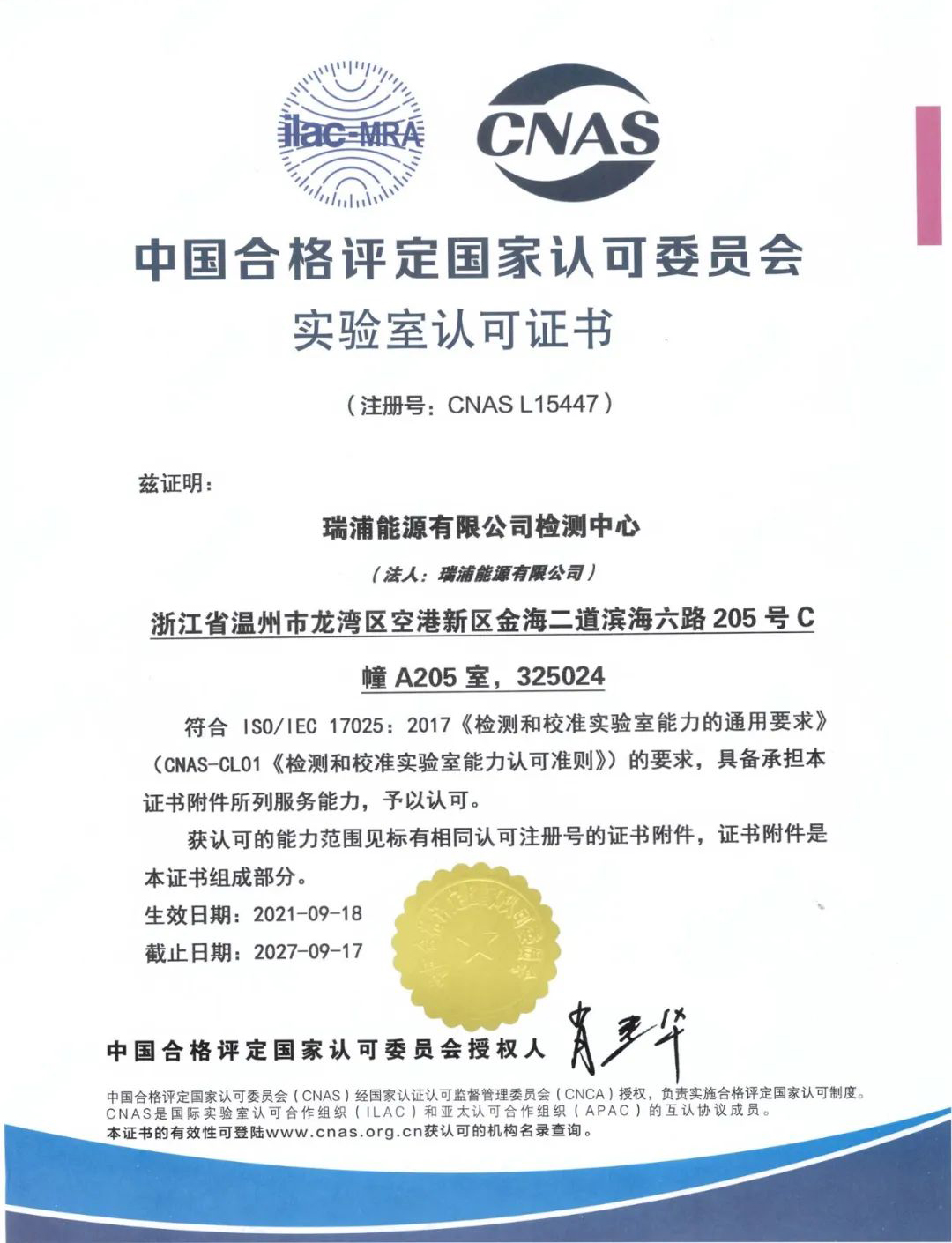 在经过高标准、专业性的文件审核以及现场审核后,9月18日,CNAS认可委员会正式向瑞浦能源有限公司检测中心颁发了CNAS认证证书(证书编号:CNAS L15447)。此次认证覆盖了GB38031-2020、GB/T 31484-2015、GB/T 31486-2015、GB/T 31467.1-2015、GB/T 31467.2-2015等5个国家标准的(温州)18项测试项目,(上海)8项测试项目。