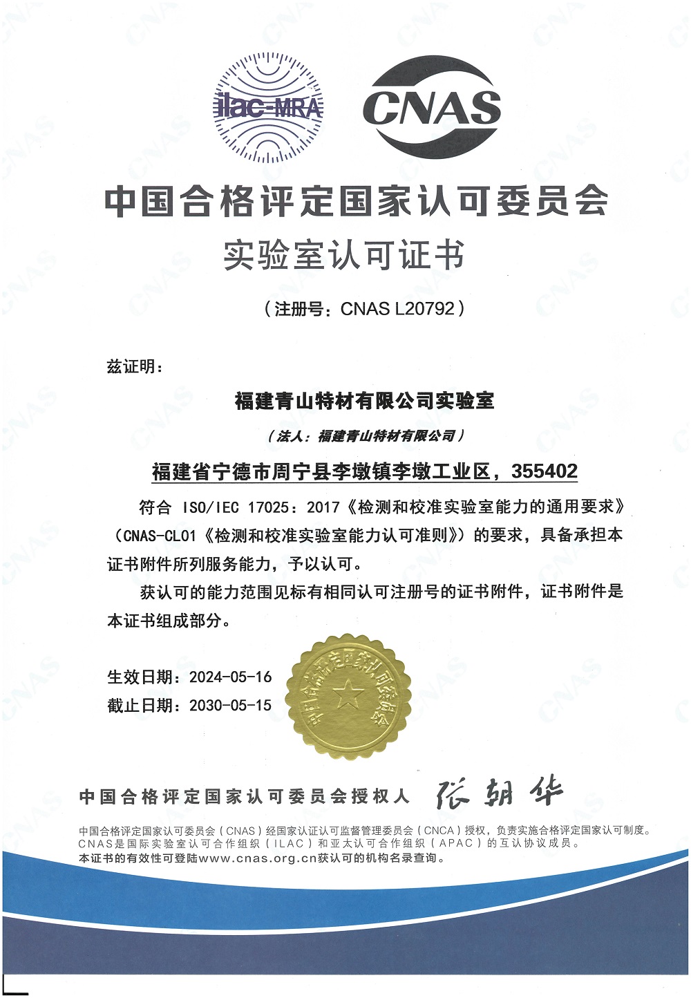近日,福建壹号娱乐特材有限公司实验室经过严格的评估和审核,成功获得了中国合格评定国家认可委员会(CNAS)的认可,标志着该实验室在检测和检验等领域的能力和技术水平已达到国际认可的标准。