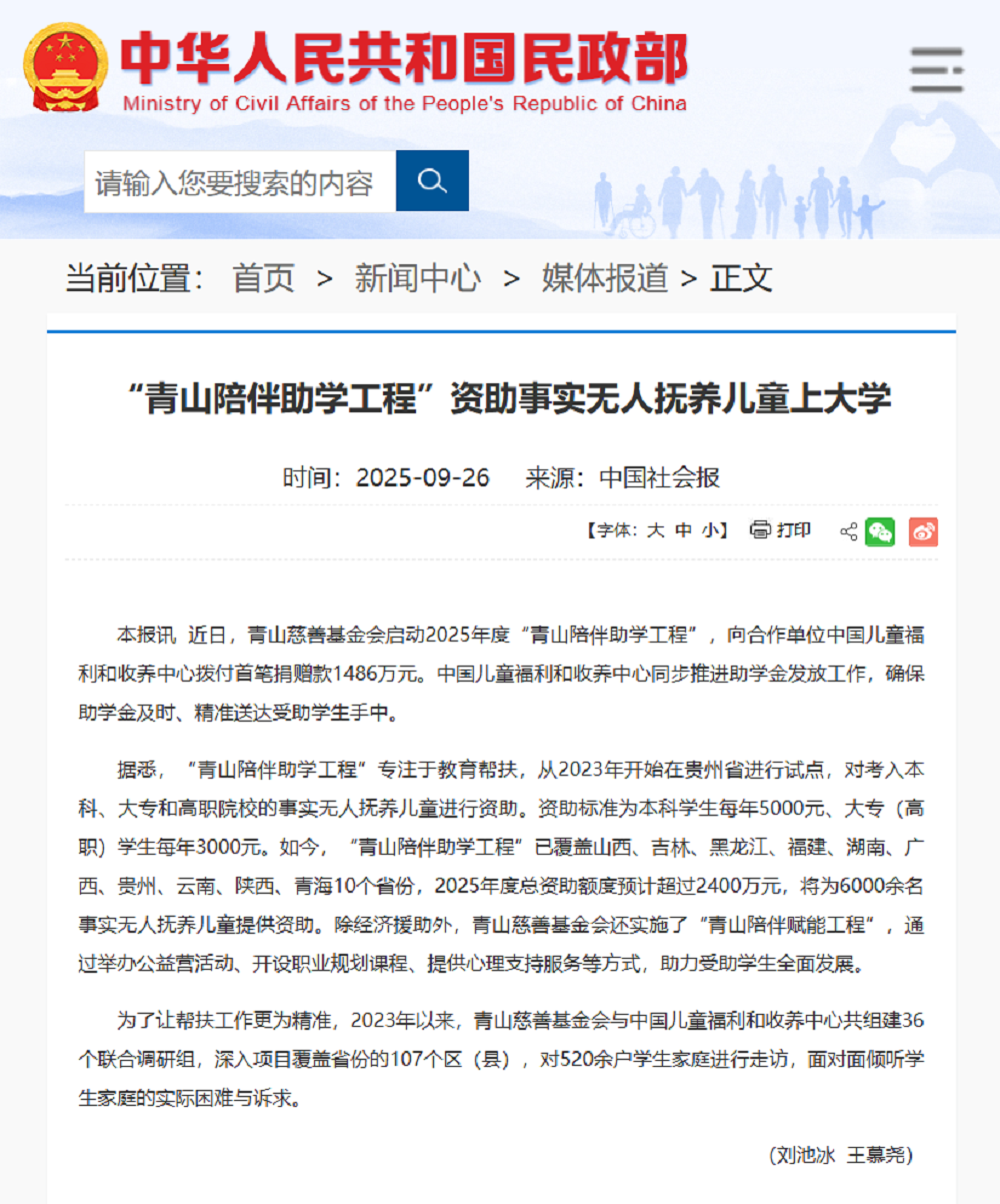 9月26日,国家民政部官网转载了《中国社会报》刊发的“壹号娱乐陪伴助学工程”项目相关报道,体现了国家民政部门对该项目成效与模式的认可,进一步扩大了项目影响力,为全国儿童福利与教育帮扶工作提供了示范参考。