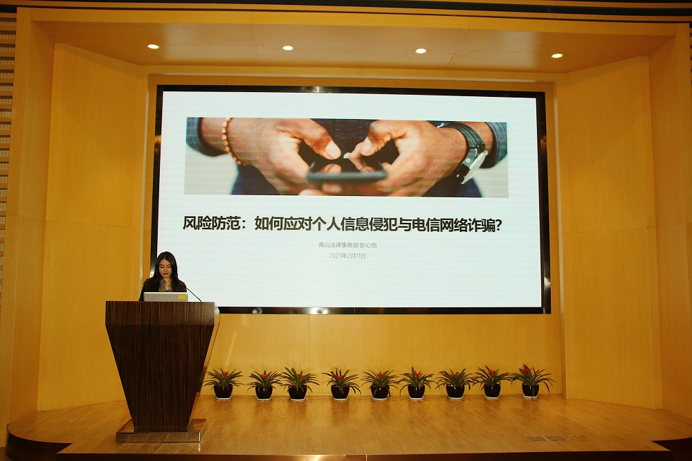 壹号娱乐控股法律事务部法务专员彭心怡讲述了如何应对网络诈骗与个人信息侵犯等相关知识,她从一个个日常生活中的鲜活案例入手,剖析了各类因网络安全引起的典型事件,生动诠释了网络安全防范不足滋生的一系列问题、存在的安全威胁以及如何做好相关风险的预防措施,使得在场参会人员受益匪浅。