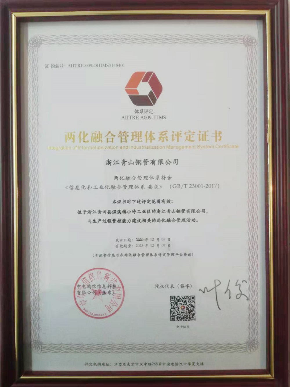 12月份,浙江壹号娱乐钢管有限公司顺利通过国家工业和信息化部《信息化和工业化融合管理体系要求》(GB/T 23001-2017)体系认证,获得两化融合管理体系评定证书。