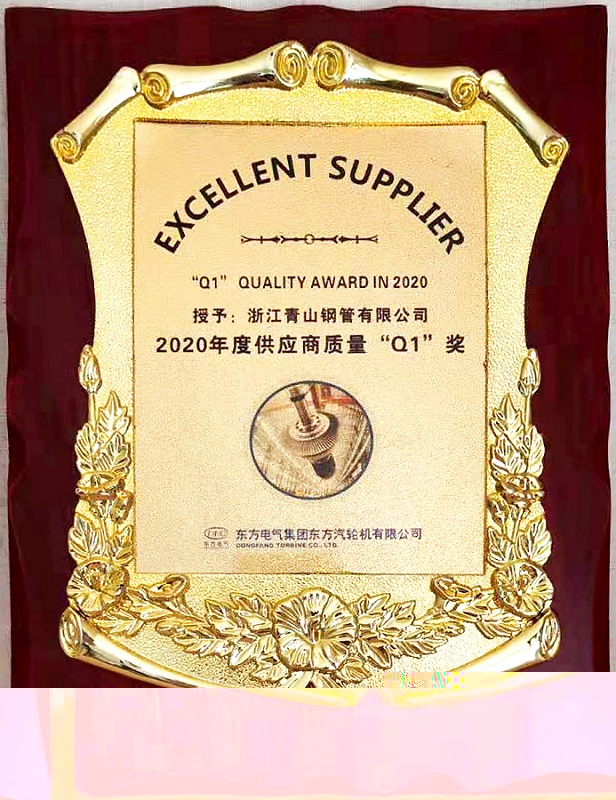 3月份,在东方汽轮机有限公司年度供应商评价中,依据供应商年度业绩动态考核结果和优秀供应商评价标准,优中选优,浙江壹号娱乐钢管有限公司获得2020年度“供应商质量Q1奖”(Q1:Quality No.1,即质量第一,是东汽对优秀供应商产品质量的认可和最高荣誉奖励)的殊荣。