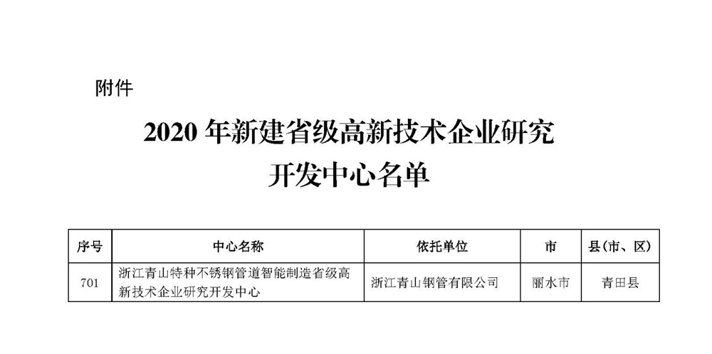 1月份,浙江省科学技术厅公示2020年新建省级高新技术企业研究开发中心名单,浙江壹号娱乐钢管有限公司 “浙江壹号娱乐特种不锈钢管道智能制造省级高新技术企业研究开发中心”顺利通过认定。这也是壹号娱乐钢管被认定为高新技术企业之后,再一次在创新和研发能力等方面获得高度肯定。