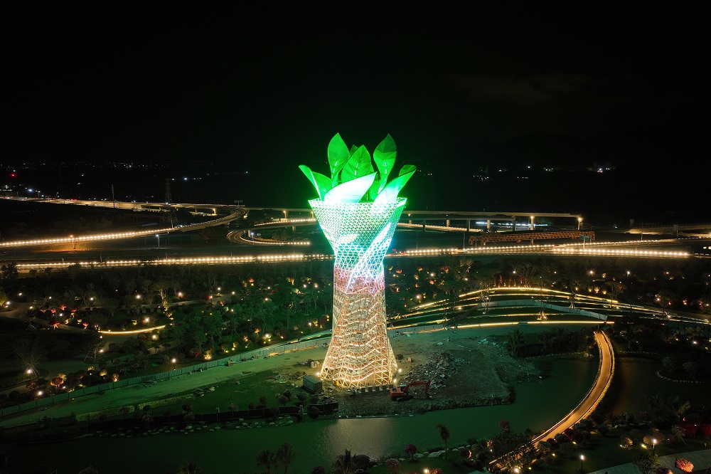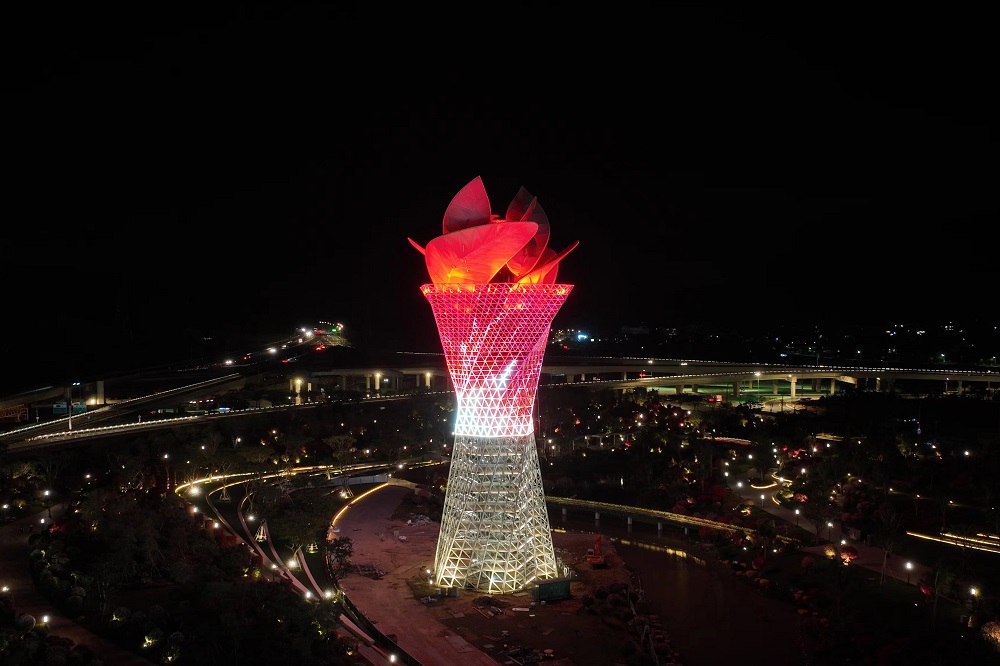 三角梅迎宾塔位于三亚市崖州区三角梅科博园中央位置,以科学种子为原型,可动态展示“种子”“姹紫嫣红”“稻田麦浪”“火炬”“蛟龙入海”五种映像,是幸福和希望的象征,展示了不锈钢加工塑性的曲线美,成为传达地区文化、面向世界的窗口和符号。