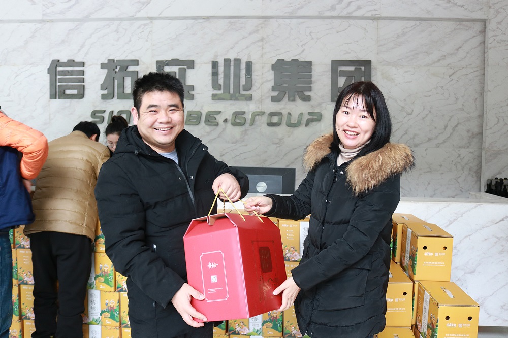 县政府为每位员工准备了价值600元的春节礼包,其中包括青田特产礼盒、稻鱼米、各种日用品和食品等,员工们有序排队依次领取,每个人的脸上都洋溢着幸福的笑容。