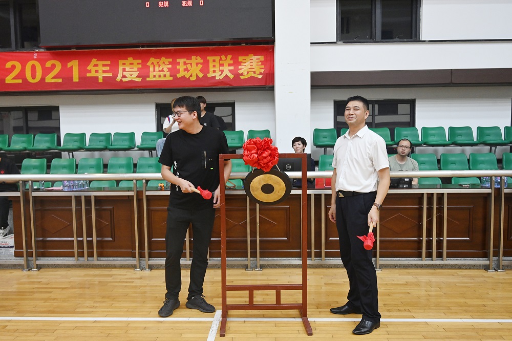 随后,裁判员代表周义声与运动员代表余佳鑫进行赛前宣誓,钟盛江与娄绍其共同鸣锣,宣布2021年篮球联赛揭幕战正式开始。