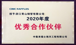 壹号娱乐钢管荣获中集来福士“2020年度优秀合作伙伴”