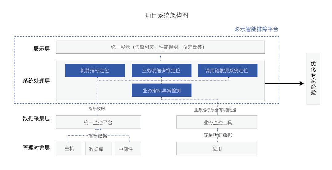 某股份制银行智能运维平台建设项目旨在利用人工智能技术提升运维效率,丰富智能化应用场景,逐步推动AIOps落地实践。必示智能运维平台通过对基础设施监控、业务监控和跑批平台数据的接入,实现机器指标、业务指标、交易明细及批处理信息的汇聚。与此同时,平台可通过系统内算法处理实现智能故障预警及故障定位,提升排障效率及系统可用性。