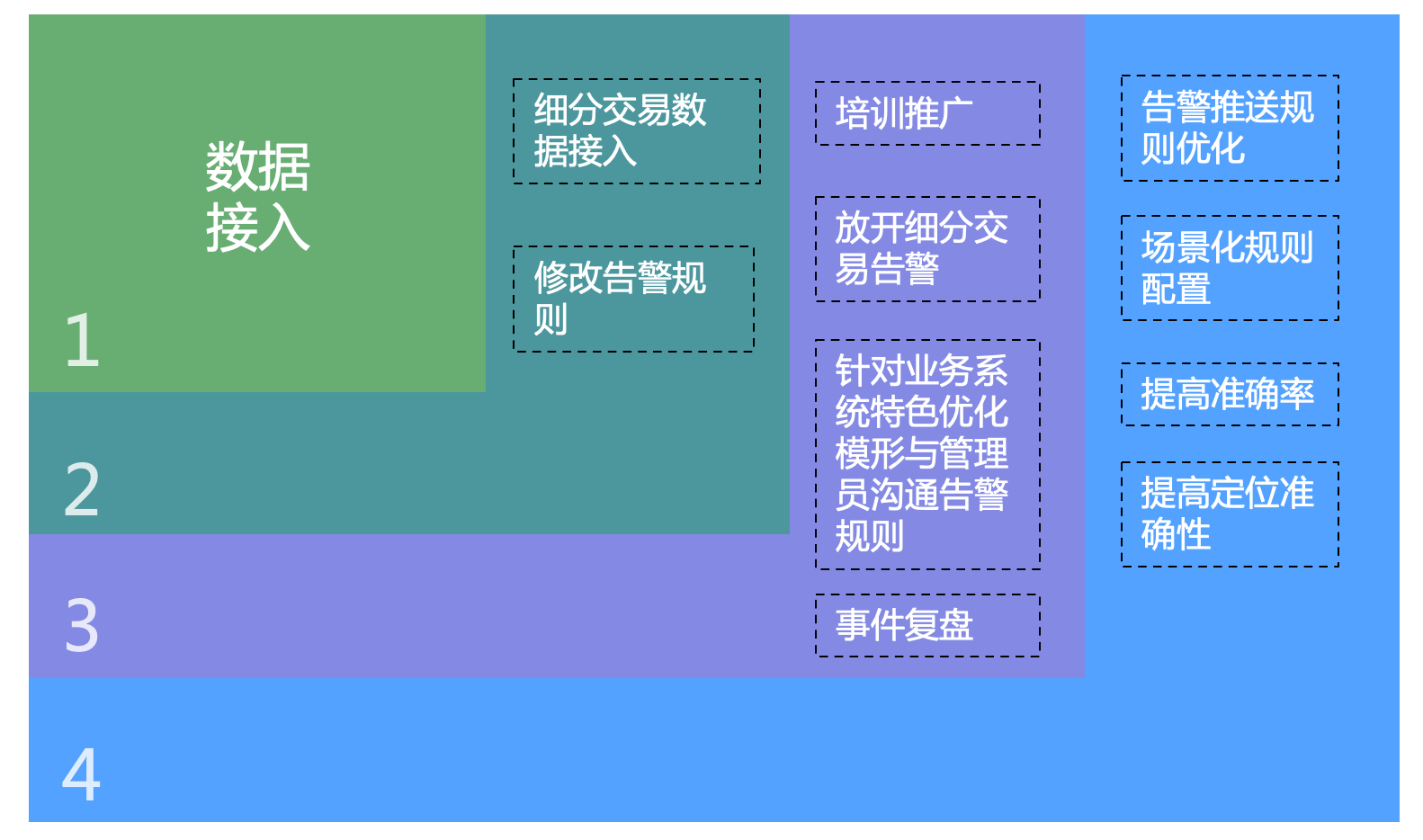 - 放开所有细分交易告警,针对告警量较多的系统与相关管理员沟通确认;调整模型与告警触发规则等,提升告警准确性;与管理员持续沟通,迭代优化告警数据。