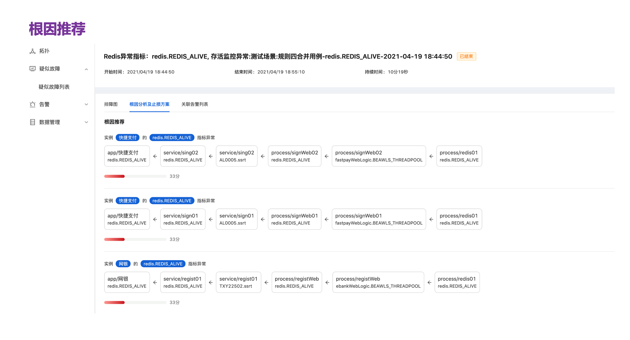 此外,必示智能运维平台的根因推荐功能,旨在进一步加强平台对管理员的辅助能力。根因推荐功能通过配置关系、专家经验、历史规律、日志及指标数据确定故障的范围,识别表现异常的系统、交易、设备等实体和指标,基于配置关系、专家经验、历史规律,实现AI智能关联分析,判定故障根源,简化定位流程,将管理员关注点从繁琐的海量告警分析转移到实际故障应对上。
