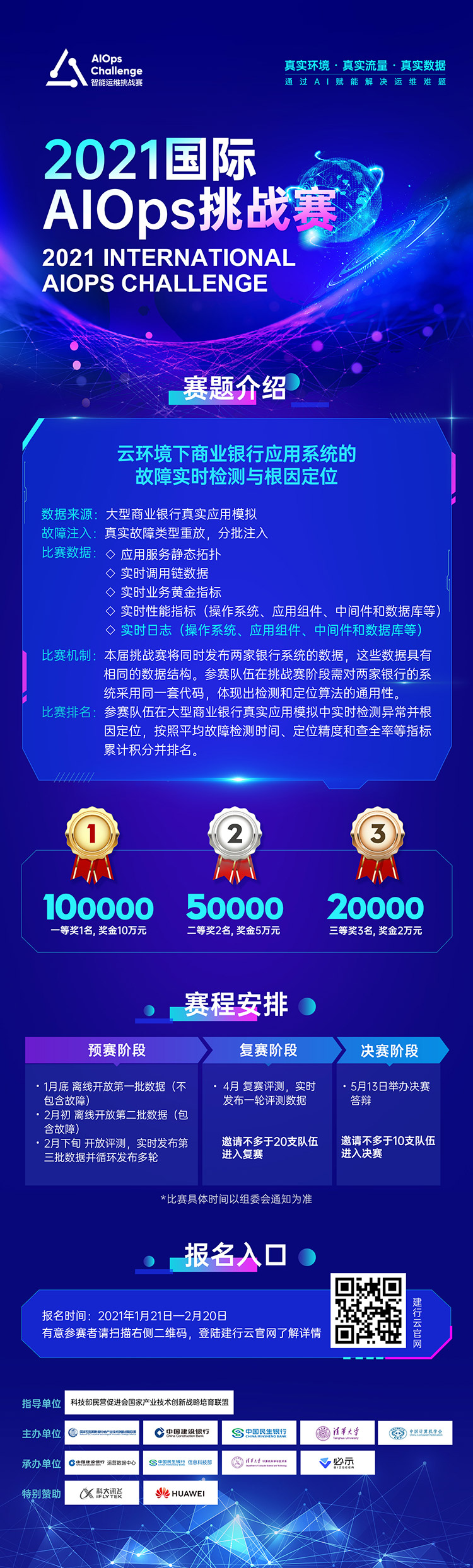 国际AIOps挑战赛是由清华大学联合中国计算机学会(CCF)发起的智能运维领域最具影响力的专业赛事,迄今已成功举办三届。2021年第四届国际AIOps挑战赛将进行重要战略升级,作为第一届国际互联网产业科技创新大会暨互联网创新产品展览会(NIICON,以下简称“科创会”)的重要组成部分,由科技部民营促进会国家产业技术创新战略培育联盟指导;国家互联网数据中心产业技术创新战略联盟(NIISA)、中国建设银行股份有限公司、中国民生银行股份有限公司、清华大学、中国计算机学会(CCF)主办;中国建设银行股份有限公司运营数据中心、中国民生银行股份有限公司信息科技部、清华大学计算机科学与技术系、北京必示科技有限公司承办;科大讯飞股份有限公司、华为技术有限公司NAIE产品部特别赞助。
