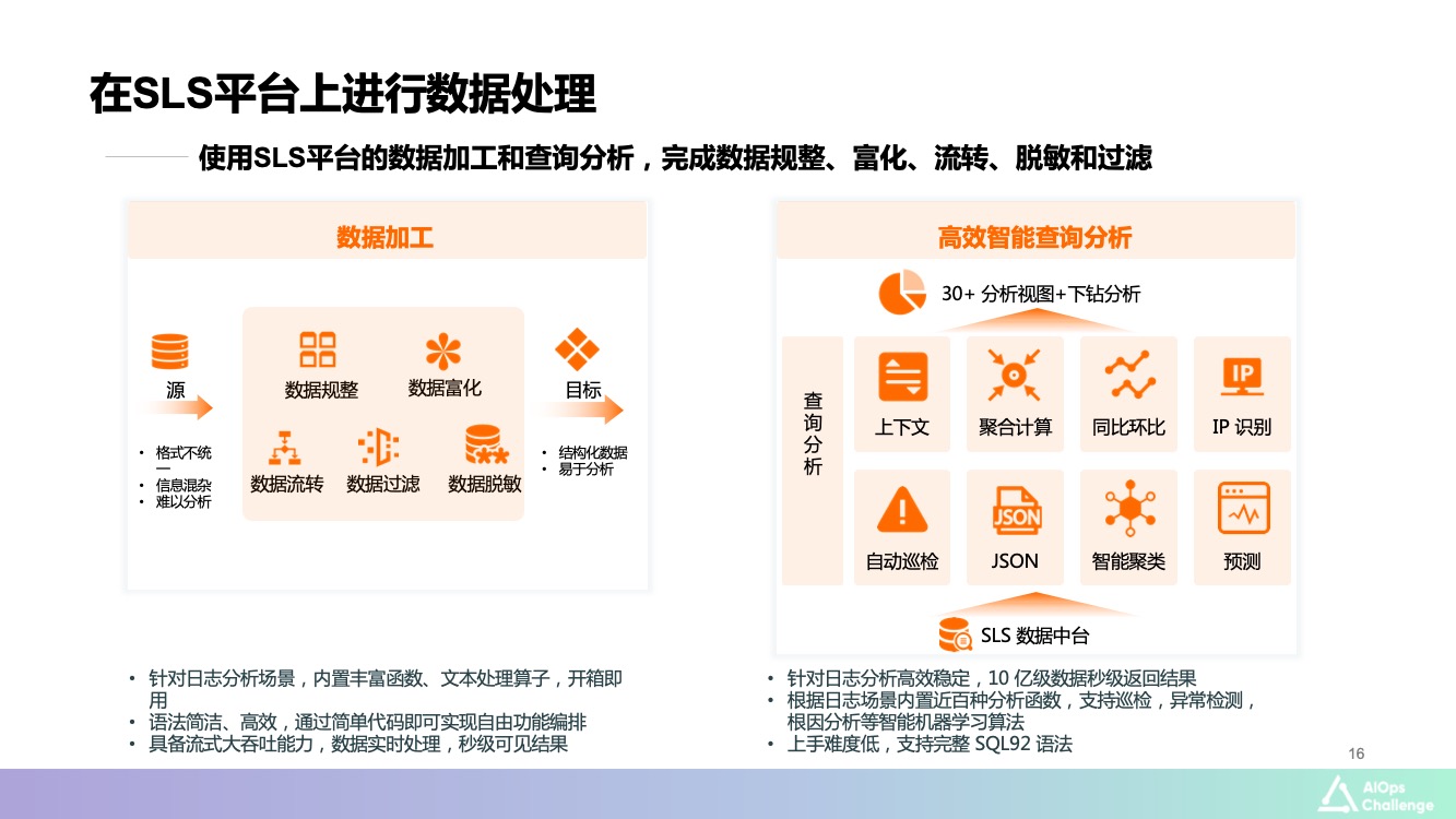 在SLS平台获取数据以及数据处理,通过数据加工完成数据规整、富化、流转、脱敏和过滤;同时通过查询分析得到处理后的结构化数据。