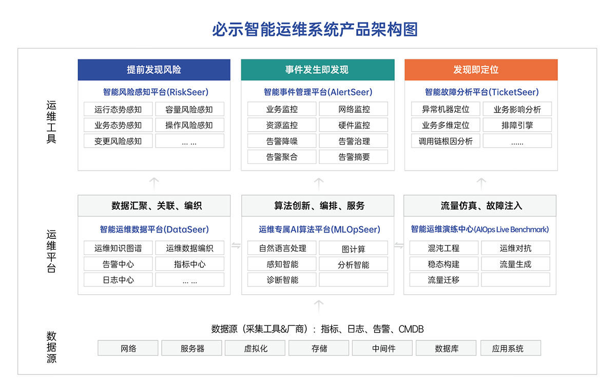 在企业建设智能运维过程中,场景实现是智能运维系统建设的中心,同时也是”通过AI技术解决运维问题“的抓手。必示科技以“场景实现”为中心,为银行、券商、保险、电信、制造等行业企业提供智能风险感知平台、智能事件管理平台、智能故障分析平台、智能运维数据平台、运维专属AI算法平台和智能运维演练中心产品矩阵,从事前预测和防范、事中快速分析定位和处理、事后经验知识沉淀,并以此为循环,在防范和处理运维问题的同时不断提升智能运维平台能力,最终降低MTTR,延长MTBF。