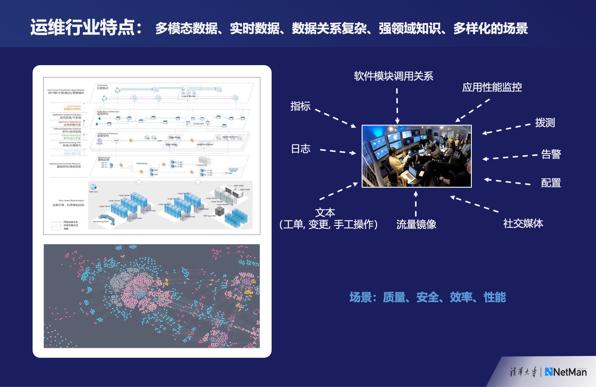 运维行业有其独特的特点。以某银行IT系统架构为例,如果将数据中心中的每个组件视为一个节点,并将它们连接成一个知识图谱,大约有400多万个节点和几千万条边,每个节点都有自己的监控数据,而且这些数据是多模态的。例如,最常见的可观测性数据是指标、日志、调用关系等数据,这些数据间的关系非常复杂,而且需要深厚的领域知识才能理解。作为运维人员,我们需要了解IT架构、数据中心运作方式以及软件工程的架构,才能做好运维工作。因此,领域知识对我们来说非常重要。同时,运维的场景也非常丰富,涉及到故障、质量、安全、效率和性能等多个方面。总之,运维领域是一个非常复杂的庞大场景,这是运维行业的特点。