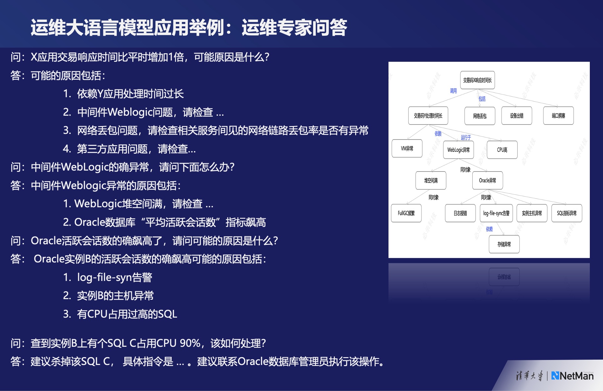 具体而言,在这个例子中如果出现交易响应时间长的问题,可能会问到:现在出现这个问题的可能原因是什么?这与之前提到的诊断图中的问题类似,我们需要确定是否是web出现了问题,然后逐步解决问题,最终给出处置建议。大语言模型确实有一个“思维更全面”的优点,就像我之前提到的医学实验一样(在实验中发现MedGPT在应用中可能会稍微啰嗦一些,会东问一下西问一下,但是它的思考更加全面。相比一般的医生,在一些相对不常见的情况下,更能发挥一定的作用)。但是需要注意的是,这个过程必须是严肃应用,杜绝幻觉,大语言模型不能自行发明一些答案。
