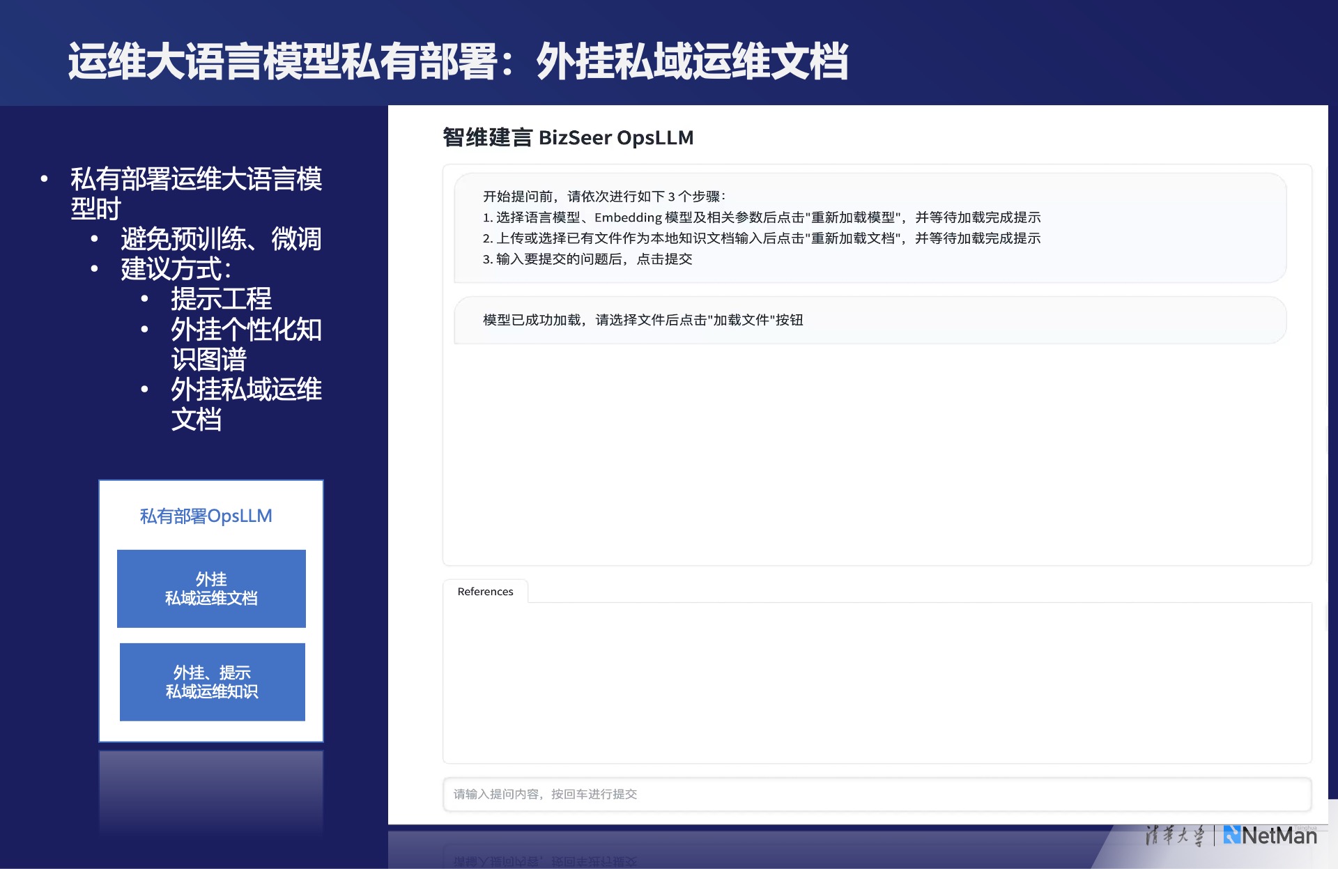 如果进行私有部署,可以参照上述模型演示。虽然很多知识是公开的,但如果这是一个私有文档(如:MySQL文档),加载进去后可以针对MySQL的知识进行查询,比如查询SQL类故障等。这种个性化的部署设计允许我们共同训练模型,以更好地理解特定的个性化文档,从而在享受运维专家知识的同时解决个性化的知识图谱和运维文档的问题。此外,还可以通过提示工程来进一步优化模型的性能。