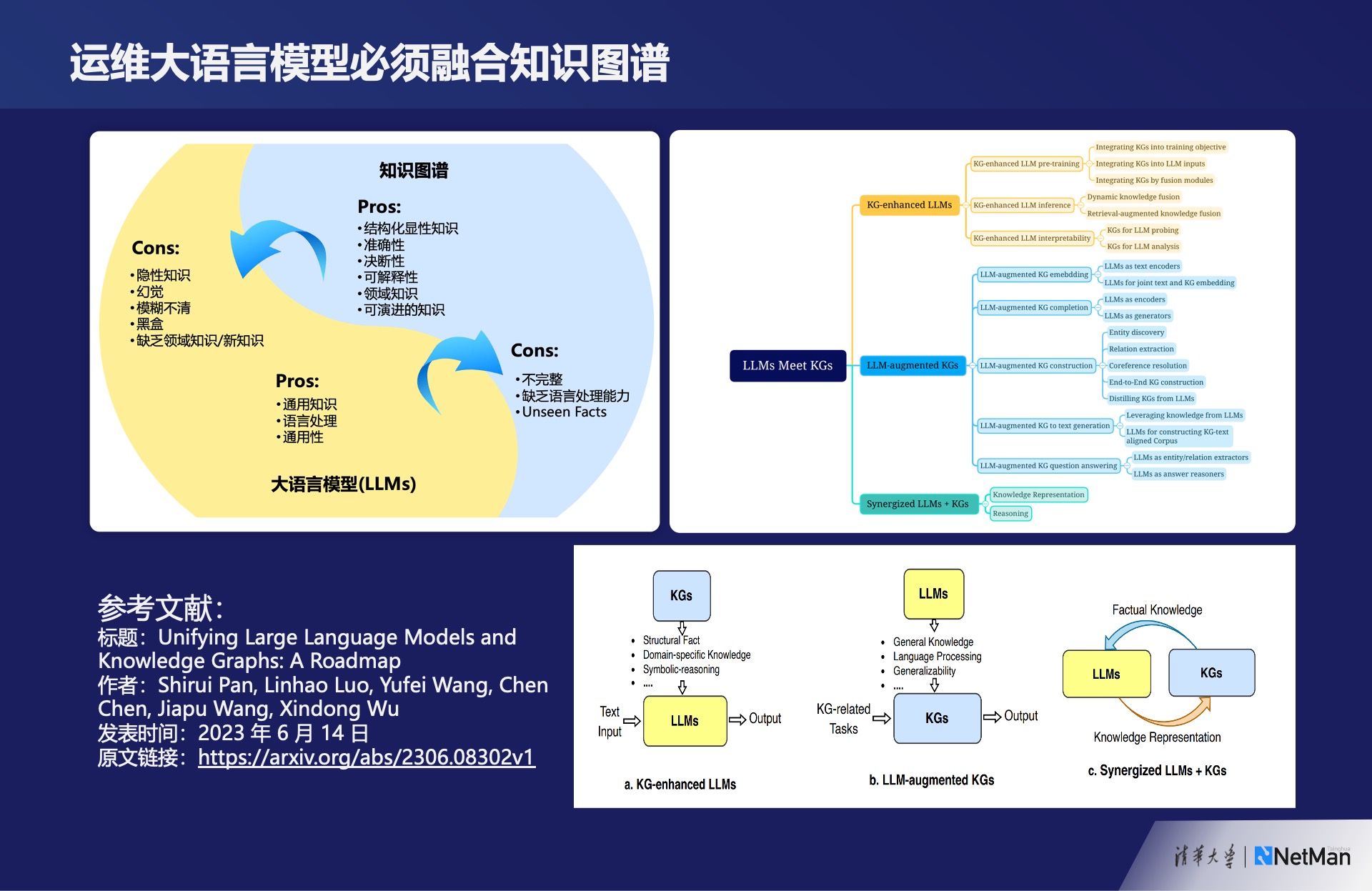 首先,要基于一个开源的大模型底座(无论是国内的百川、GLM,还是国外的LLaMA)。其次,我认为目前已经出现的技术中,知识图谱对于杜绝幻觉问题和增强可解释性是有帮助的。同时,知识图谱的构建是一个复杂的过程,不能指望专家对运维的各个子领域都非常熟悉。因此,我们需要使用混合专家模型和多模态的运维知识图谱来构建一个新的大型语言模型,即运维大语言模型(OpsLLM)。当具体应用到某个场景时,可以以外挂的形式,类似于大家使用过的文档外挂(如:DOCGPT),就像一个经验丰富的运维专家一样,到了一个新的单位,简单了解一下情况,基本上就能处理各种运维问题了。
