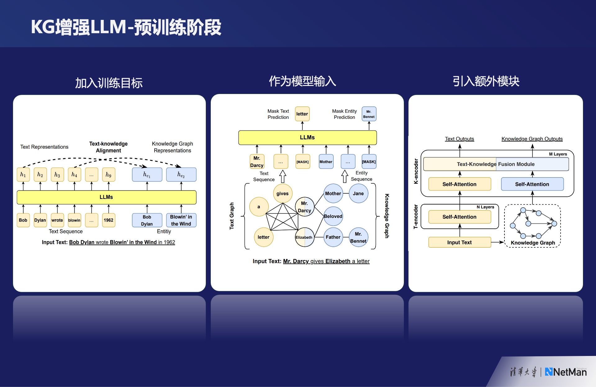 KG(知识图谱)增强LLM(大语言模型)-预训练阶段。首先,大语言模型训练时,可以把知识图谱里边的内容转换成文字。其次,把知识图谱的内容变成新的语料(当然是把握性比较强的语料),把它放进训练的里面。第三,还可以引入一些额外的单独设计的模块,作为该神经网络的架构模型都是可以的。