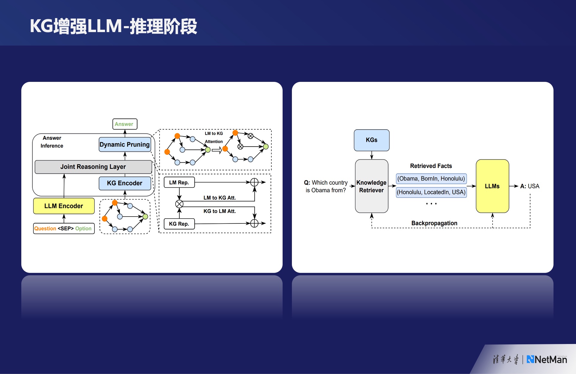 KG(知识图谱)增强LLM(大语言模型)-推理阶段,同样可以利用知识图谱进行推理。在推理过程中,可以根据当前问题利用知识图谱进行相关的工作,以得出结论。此外,还可以使用基于检索的方法。当问题出现时,可以在知识图谱中查找相应的答案辅助得出更准确、更可靠的答案,并避免产生幻觉。在推理阶段,结合知识图谱的这些方法可以提高推理的准确性和可靠性。