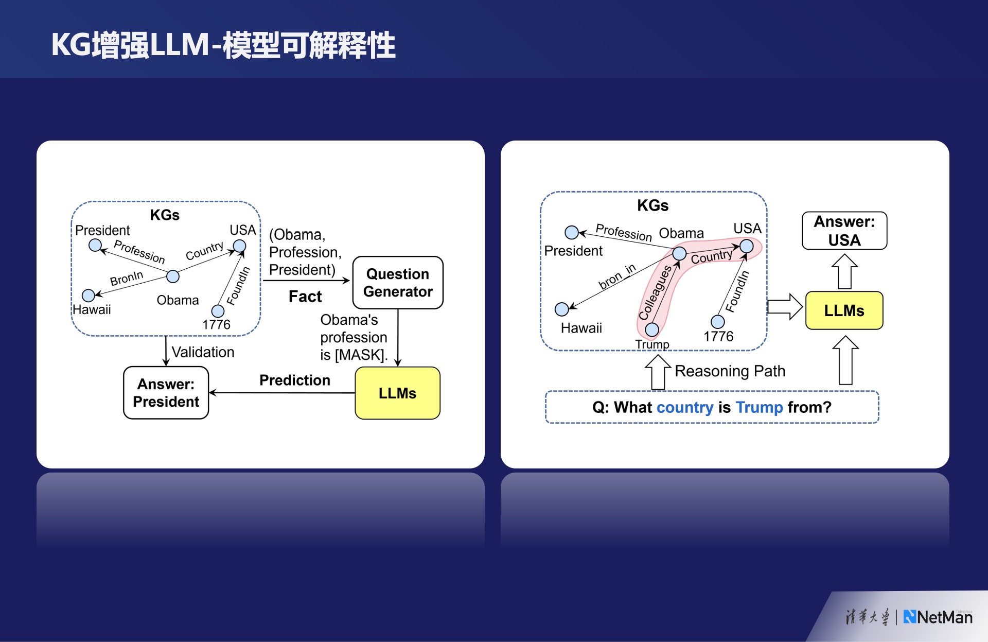KG(知识图谱)增强LLM(大语言模型)-模拟可解释性。从可解释性的角度来看,可以先由大语言模型给出一个结果,然后再用知识图谱来验证该结果的可靠性。这种方法比较直观,通过将结果与知识图谱进行对比,我们可以确定该结果是否可靠。