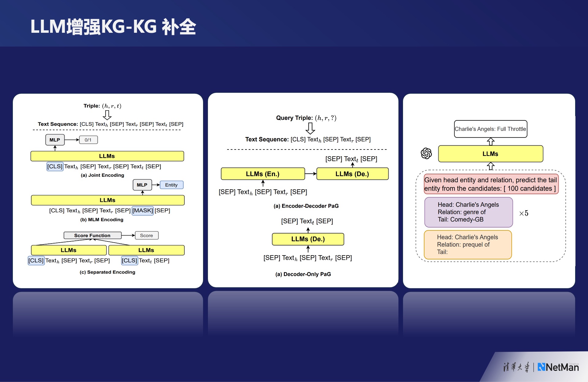 LLM(大语言模型)增强KG(知识图谱)-KG补全。我们还可以反过来利用大语言模型进行知识图谱的补全和扩充。因为它可以处理大量的语料数据,而传统知识图谱中的很多信息也是从语料中提取出来的,通过大语言模型,我们可以更好地进行知识图谱的补全和扩充,进一步完善知识图谱的知识工程构建工作。大语言模型可以通过对知识图谱进行相应的补充和扩展,使其更加完整和准确。这样的应用可以提升知识图谱的质量和可用性。
