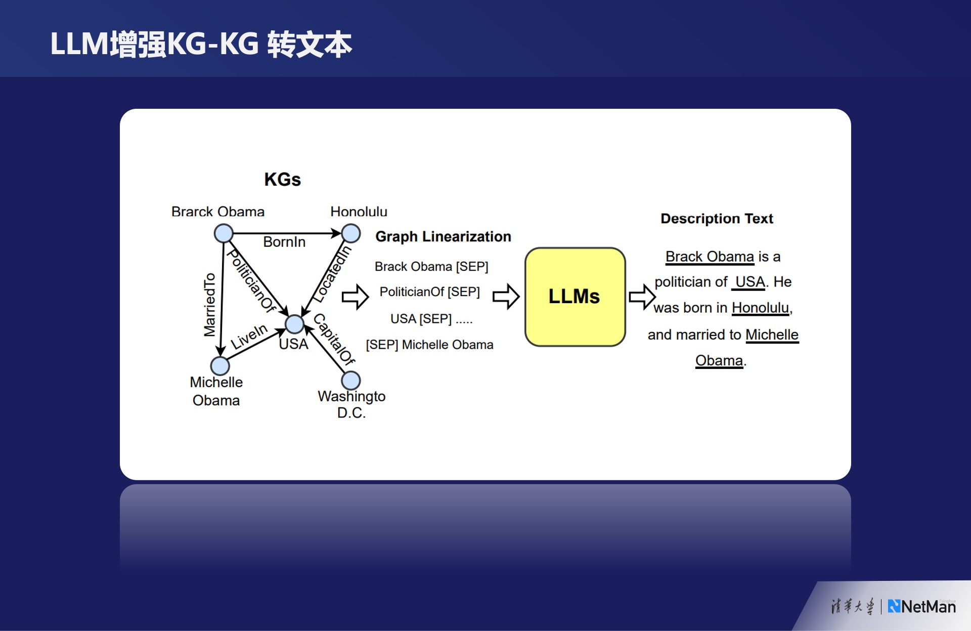 LLM(大语言模型)增强KG(知识图谱)-KG转文本。我们可以通过将知识图谱中的信息转换为自然语言文本,使其可读性更强,便于阅读和理解。这样的转换可以提升知识图谱的可用性,更加易于应用和传播。