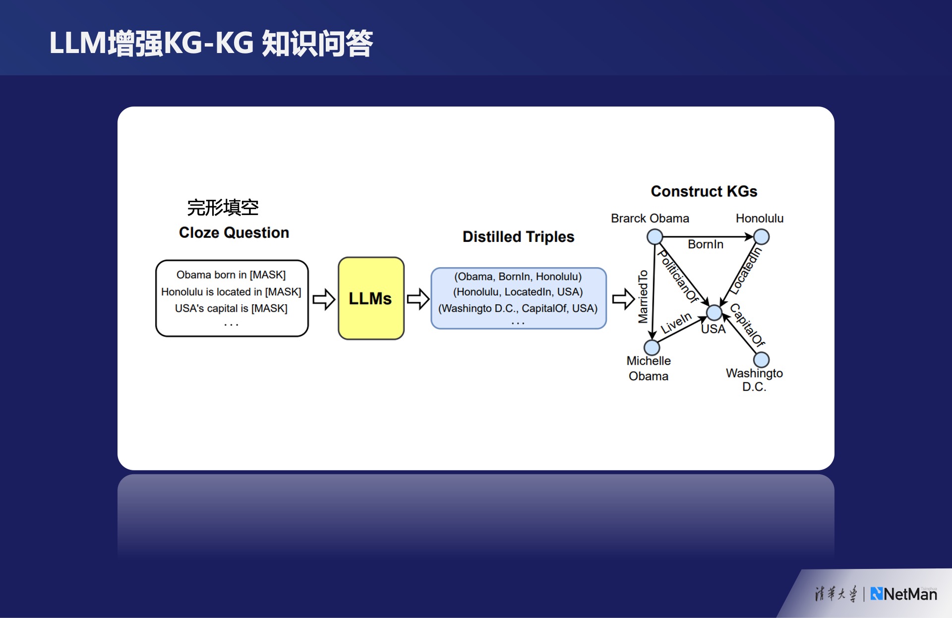 LLM(大语言模型)增强KG(知识图谱)-KG知识问答。如:用完形填空的方式写一个问题,把对应的大语言的模型调用一下,把文字处理一下,最后构建出知识图谱。