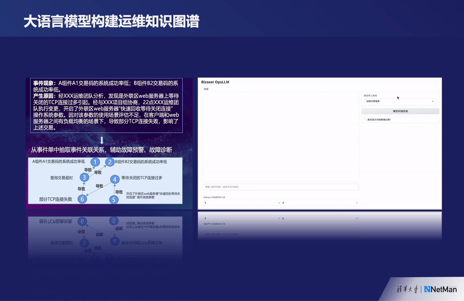 如果交给大语言模型,它可以分析并识别出因果关系,并将其补充到我们的知识图谱中。需要强调的是,这是人机协同的过程。大语言模型可以提取出许多信息和想法,但不一定完全准确。最终,我们还是需要依靠运维专家来进行审核和确认,只有在专家认为可靠的情况下,才将其纳入知识图谱。这就是大语言模型在构建运维知识图谱方面所能发挥的作用。