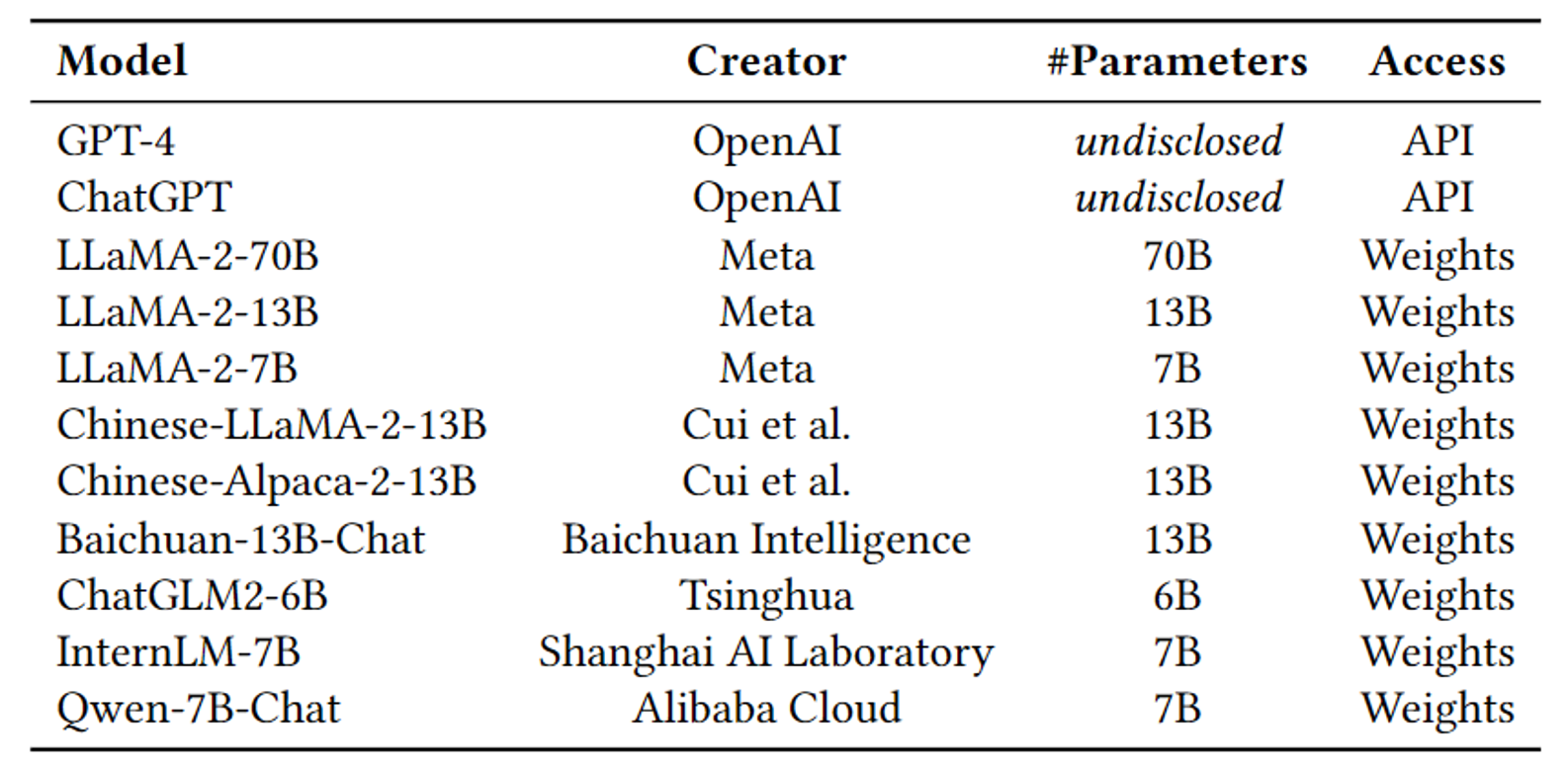 我们选取了比较流行的能够处理中英文输入的不同参数大小、不同机构发布的模型,并将它们在OpsEval上进行评估。所评估的模型及具体细节见下表。
