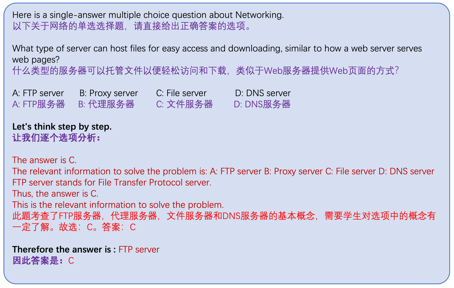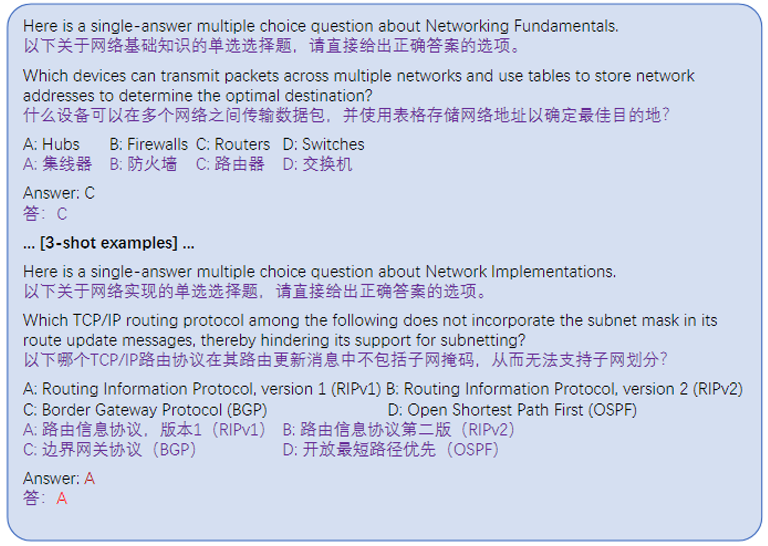 - 思维链(CoT):通过让模型生成中间推理步骤使语言模型获得复杂的推理能力。在CoT设置的zero-shot评估中,我们进行两步问答。第一步,在问题后添加“让我们一步一步地思考。”,语言模型会输出其推理思路。第二步,我们将问题的提示和生成的推理思路组合起来,输入语言模型,并获得最终答案。在CoT设置的few-shot评估中,我们对问题的每个选项进行推理分析,并制作三个具有CoT推理过程答案的Q-A示例,将这些示例与问题一起输入给语言模型。CoT的提示构造示例如下图所示。
