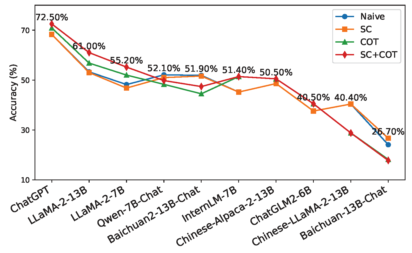 - 对于大多数模型,从Naive到SC、CoT、CoT+SC,评估性能稳步提高,其中CoT带来的提高最为显著。