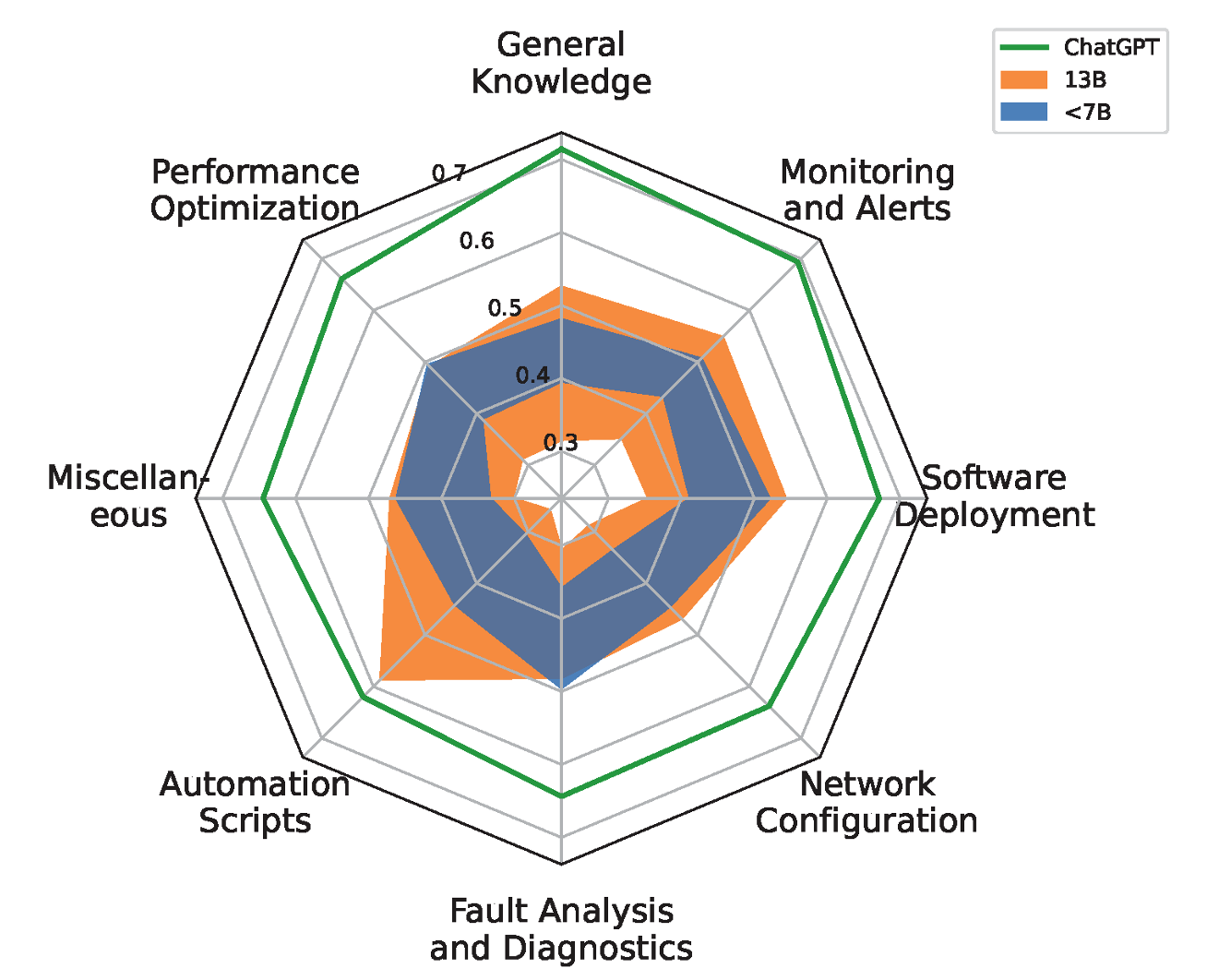 为了研究模型在不同运维场景(通用领域知识、监控告警、软件部署、网络配置、故障分析与诊断、自动化脚本、性能优化、混合型任务)以及不同任务(知识回忆、分析思考和实际应用)中的表现,我们根据前文提到的结构化评分分类,总结了不同参数大小模型组的结果。