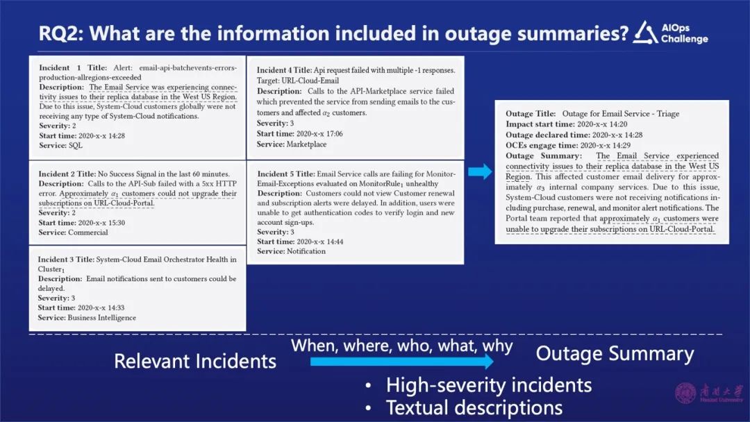 在此之前,故障摘要的生成是通过人工的方式去完成的,费时费力且容易出错。微软在这方面做了一些事件聚合的尝试工作,但是把事件聚合完了之后,还是需要运维工程师去人工查看。这里有两个挑战:首先,需要运维工程师判断哪些信息是有用的。其次,需要总结领域特定的、与云相关的故障信息。