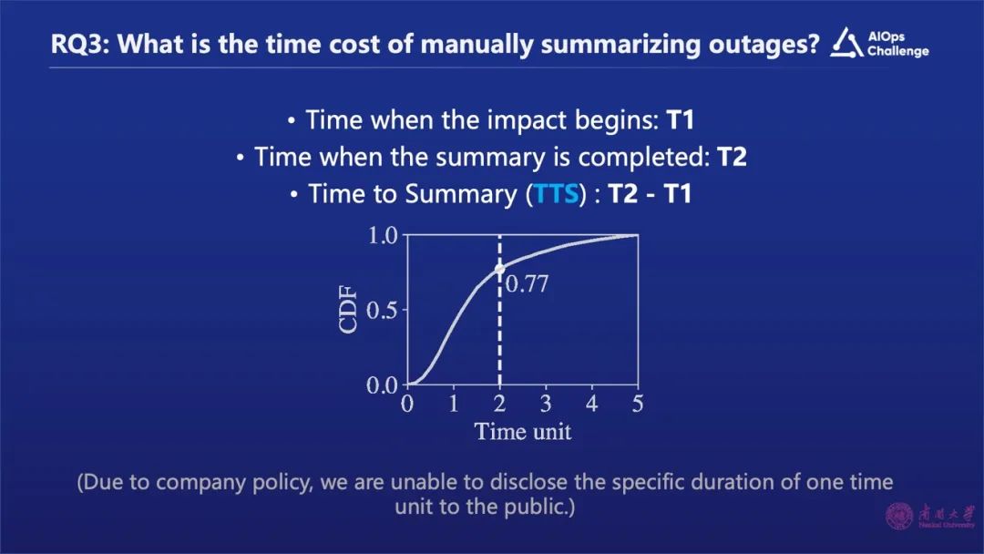 我们做了一个统计,如上图所示“T1”代表了故障开始时间, “T2”代表运维工程师写完故障摘要的时间,用“T2”减“T1”表示整个故障摘要生成的时间。我们会发现超过23%的故障花费的时间是超过两个时间单位的,耗时比较长。