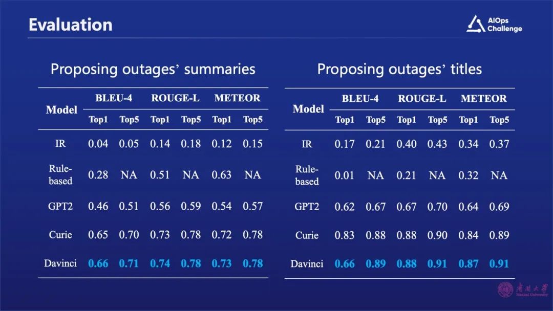 上图中展示的是我们的实验结果,其中Chat GPT3.5在故障摘要生成方面效果显著优于Chat GPT 2和其它规则或检索生成方式。