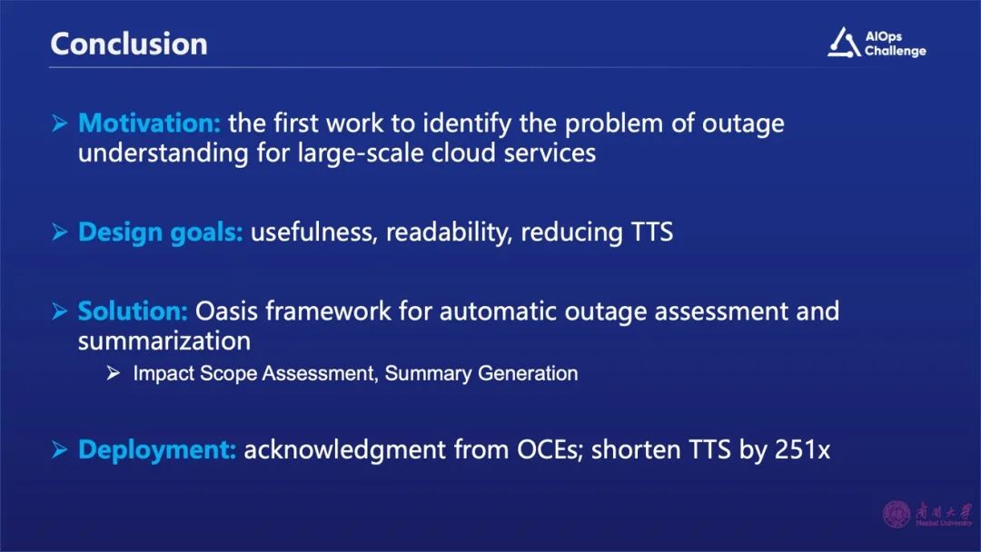 我们的研究首先是对大规模的云服务故障做一个分析;同时设计了一个有用且可读的技术框架,能够大幅降低故障摘要的生成时间;最后我们研究成果得到了微软工程师们的认可,证明该方法确实能够大幅降低故障摘要生成的时间。