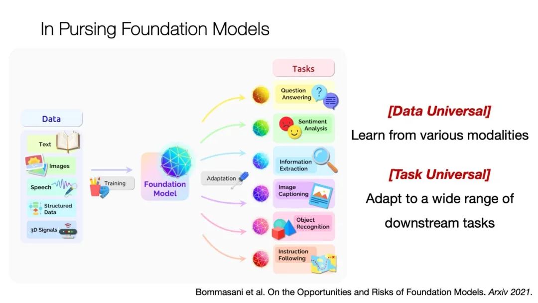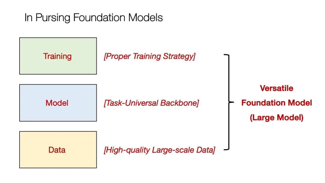 通常情况下,我们要建立一个这样的Foundation Model模型,需要很多种类的内容,比如大数据、模型结构的设计以及训练方法,只有这三方面都具备之后,我们才能够去完成一个大模型的设计。