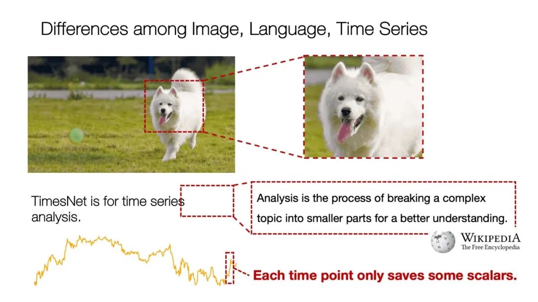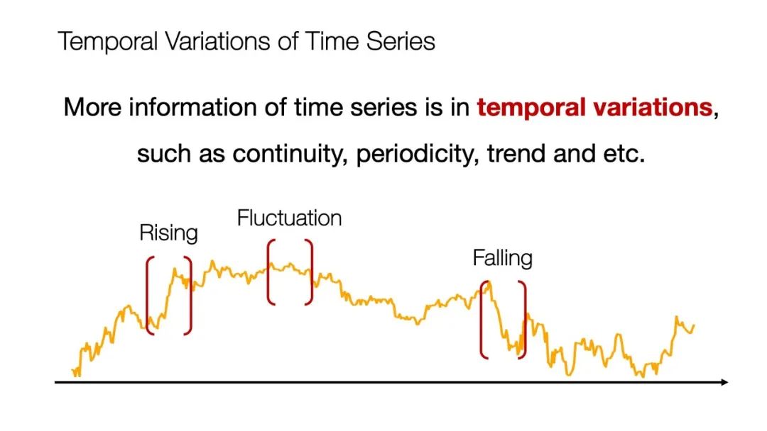 对于图像和自然语言来说,即使是很小的一部分,比如图像中一个局部或者语言之中的一个词,它都含有非常丰富的语义信息。但对于时间序列而言就特别不一样了,因为时间序列上的每一个小的时刻,都是只包含几个常数,信息量非常少,更多的信息其实被包含在了这个时间序列的变化之中,我们把它叫做Temporal Variations。