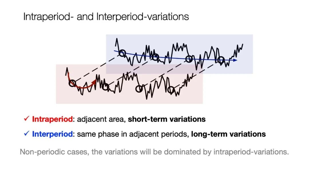 同时我们深入到每个周期,发现它还包括周期内和周期间的变化。周期内就是short-term的变化,是由于时间序列连续性造成的。周期间是不同周期相同相位的过程,是时间序列的一个long-term的信息,如何让模型同时捕捉周期内和周期间的属性,也是我们研究的一个重点。