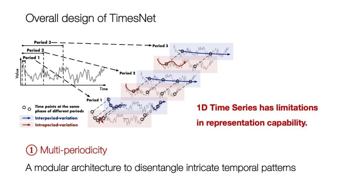 基于上述两个观察,我们设计了TimesNet模型。为了建模多周期,它天然使用了A modular一种模块化的思路,把一个时间序列分解成多个周期去处理。