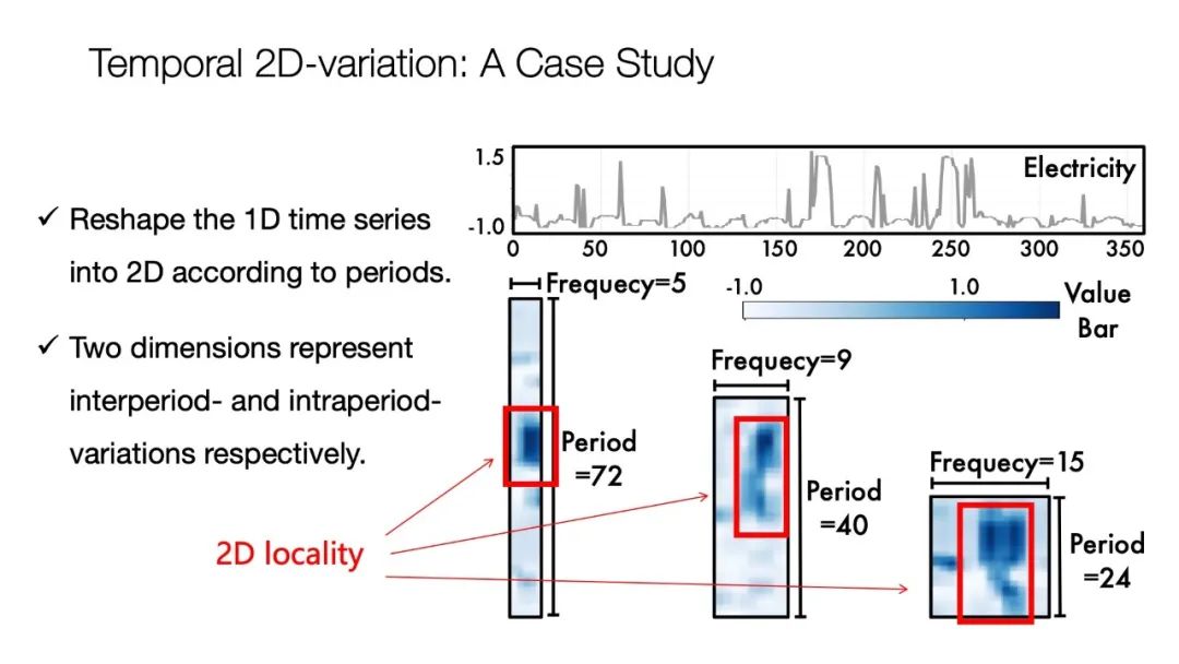 我们举个例子,图片中展示的是一个电力数据集,我们发现电力数据集有多个周期,包括Period 72、 Period 40和Period 24等等。重新排布之后,这个时间序列就变得特别的有趣了,原来的时间序列是很复杂的,现在它竟然表现出了一些locality也就是有一些局部性。这个其实很好理解,就是你和你周围的点相似,你和不同周期相同相位的点也是相似的,这样的2D locality在视觉之中是被非常重视的一种特征。