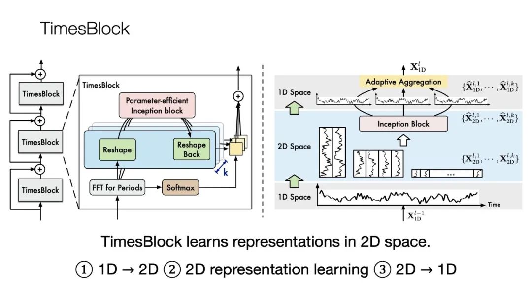 具体的设计方法是首先在1D空间之中去学特征,然后通过FFT寻找周期,得到周期之后,把它折叠成二维的Tensor,然后用2D的Kernel去处理,最后在1D空间之中把这个特征结合起来。
