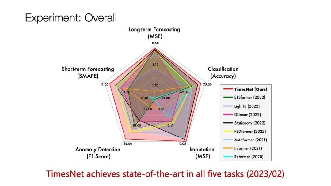 我们的研究成果在Long-term Forecasting、Short-term Forecasting、Imputation、Classification、Anomaly Detection这5种任务上进行了测试,结果是非常令人兴奋的,5种任务都取得了令人满意的效果。