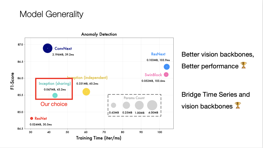 刚才我们提到了设计方式可以让时间序列原始的1D的时间序列和视觉领域的一些前沿工作结合起来,把2D Kernel换成ConvNext(这是CV领域一个非常棒的工作)效果可以进一步的提升。但是因为我们要trade off efficiency和performance,最后我们选择了一个Inception的结构。
