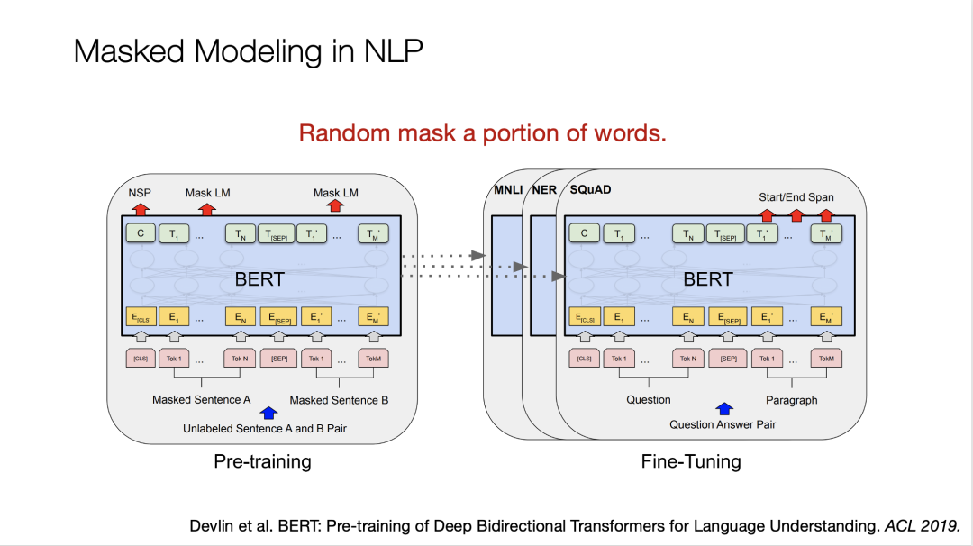 最近在深度学习领域有一个非常火的训练方法叫Masked Modeling(掩码重建),掩码重建思想在自然语言和CV里面被广泛使用,比如BERT或者MAE等。