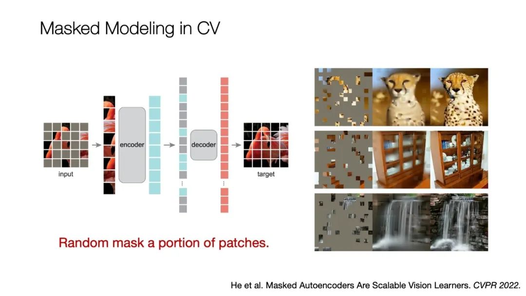 最开始我们关注MAE的时候感觉非常惊艳。如果把一张图像75%的部分遮挡,得到的是左边图像的效果,然后拿一个深度模型去重建遮挡的部分。右边是重建的结果,效果非常理想。我想如果让一个人类去重建,比如重建一个花豹,大概率不如深度模型做的好。